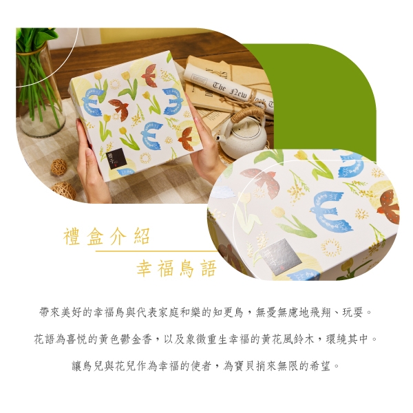帶來美好的幸福鳥與代表家庭和樂的知更鳥,無憂無慮地飛翔、玩耍。花語為喜悅的黃色鬱金香,以及象徵重生幸福的黃花風鈴木,環繞其中,讓鳥兒與花兒化作幸福的使者,為寶貝捎來無限的希望。