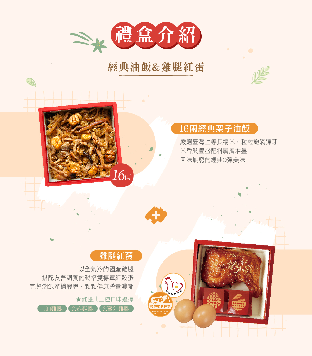 傳統經典彌月組合,經典油飯和雞腿紅蛋的飽滿祝福,承載世代相傳的心意。