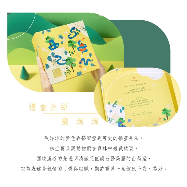 暖洋洋的黃色調搭配童趣可愛的插畫手法。初生寶貝與動物們在森林中嬉戲玩耍,圍繞滿谷的是透明清澈又低調散發美麗的山荷葉,完美表達著親情的可貴與細膩,期許寶貝一生健康平安、美好。