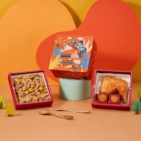 傳統經典彌月組合,經典油飯和雞腿紅蛋的飽滿祝福,承載世代相傳的心意。