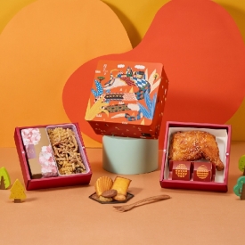 人氣中西合併組合,將經典油飯的暖香、手作糕點的甜美、雞腿紅蛋的祝福巧妙融合,一盒承載鹹甜平衡與滿滿心意。