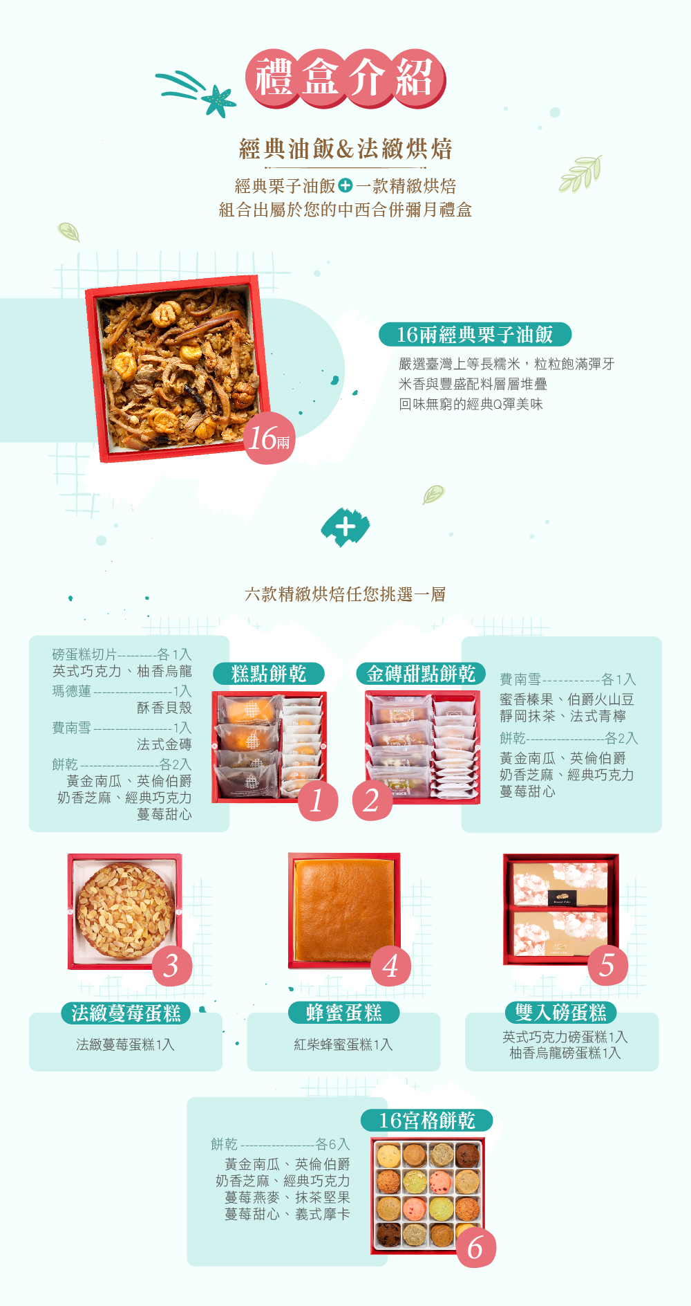 ⑷法緻蔓莓蛋糕 ⑸雙入磅蛋糕 ⑹十六宮格餅乾