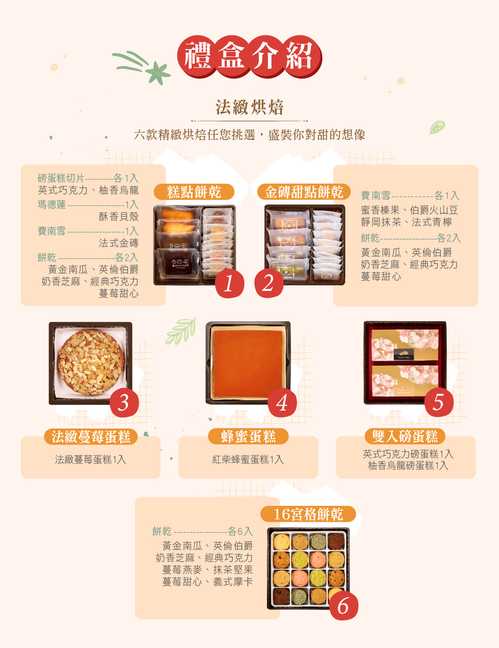 ⑷法緻蔓莓蛋糕 ⑸雙入磅蛋糕 ⑹十六宮格餅乾