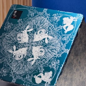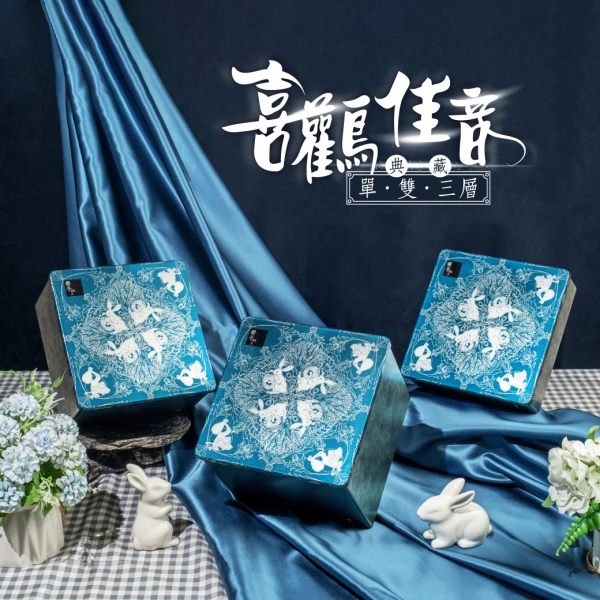 選用神秘湛藍搭配星空銀白色,帶出純淨且自由的華麗質感,以璀璨細緻的紋樣織製,寓有新生兒為家庭帶來美滿,與幸福的送子鳥伴與吉兔來朝,象徵珍貴的新生報到,迎來滿滿的喜悅與祝福。